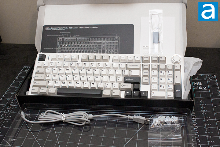 When I opened the box, I was greeted with a manual and a black card with quick start instructions. Below it, there is a solid plastic cover on top of the keyboard wrapped in a translucent bag. To the top of the keyboard, there are two cardboard housings. Opening it up, I found the USB cable, keycap puller, and a bag with four extra switches sneakily hiding. After taking out the keyboard, the USB dongle was in a slot built into the keyboard frame on the top side face.