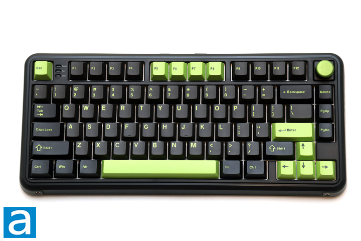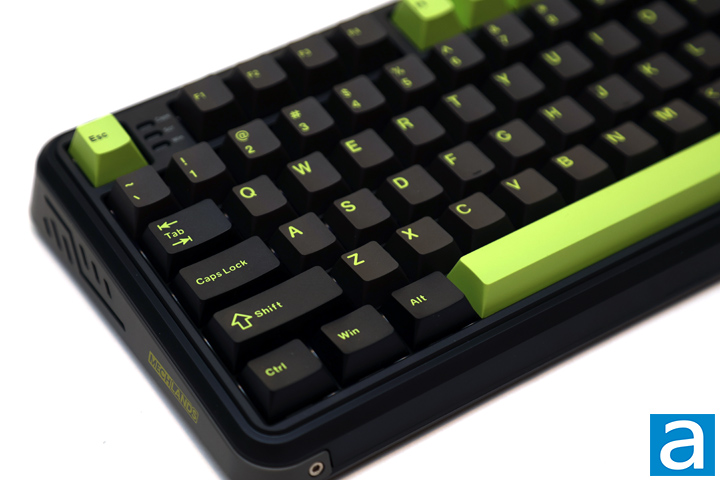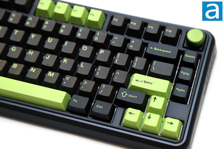 You will notice the similarities of the MechLands M75 with the Vibe75. Both keyboards share the same shape with their rounded bodies. These curved corners and sides slope downward and out. Of course, the primary difference is the color, as we have a green-and-black color scheme. All the alphanumeric keys and some of the modifiers are black with green legends, while the inverse can be found on other modifiers and function keys. Unlike the Vibe75, the M75 has a gray plastic frame that borders around the sides and top. In addition, we only have a green volume knob at the top that reminds me of Shrek, at least in color. Overall, I do prefer the blue shades on the Vibe75, but I still like the overall appearance of the M75, even if it only comes in this green-and-black color scheme.