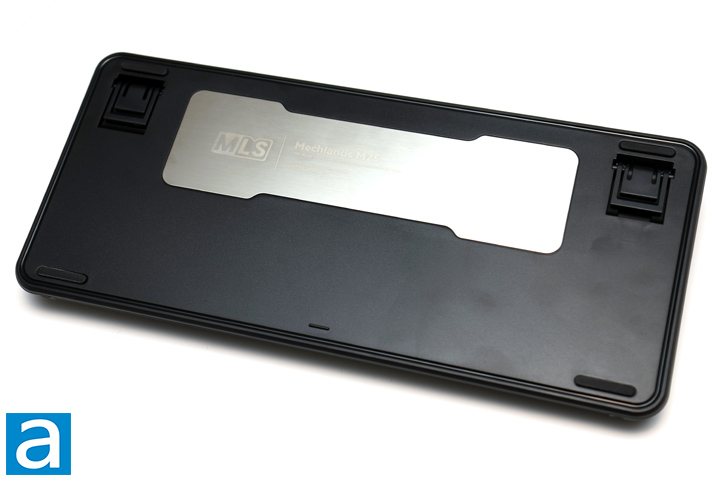 The bottom of the MechLands M75 is clean with a few interesting elements. The first one is the metal plate in the middle, which has the product name and description etched into it. It also states this was made in China. Each corner has rubber padding to keep the keyboard in place. This ensures the keyboard does not easily move about. On the top corners, there are a pair of paired extending feet. This provides a total of three different incline levels, letting users choose how high or low they want their keyboard to sit. All the feet are rubber-tipped to provide a grippy hold to its surface when inclined.