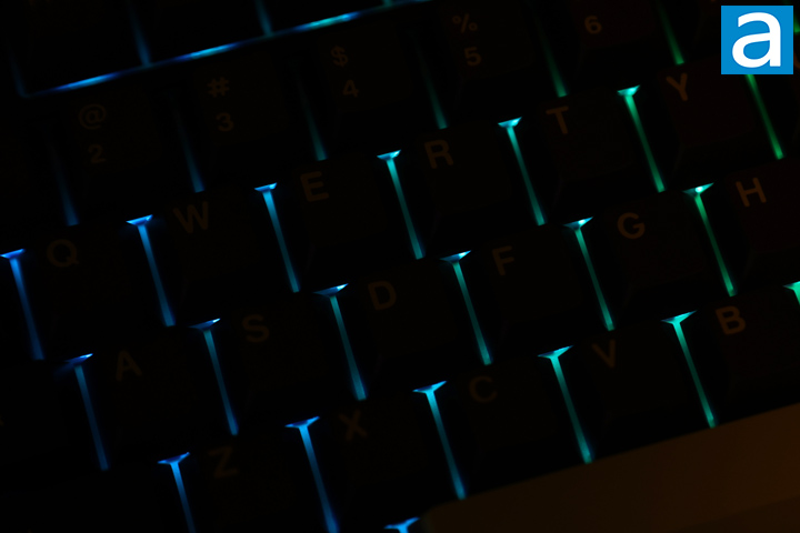The backlighting of the MechLands M75, with its opaque keys, is not too impressive. Its double-shot PBT keycaps with no shine-through legends means none of the legends light up when the light is turned on. Instead, the illumination acts more as an undergrow. The LED lighting under each switch is south facing, which makes it a bit more visible to the user. At maximum brightness, the lights are bright, even if they are obstructed by the keys. The lighting options are typical with different effects, including rainbow, static, dynamic, and reactive modes. All of these can be configured through the software or with secondary functions. These shortcuts are found on the arrow cluster. Up and down are used to increase or decrease the brightness while left and right decrease and increase the effect speed, where applicable. Backspace lets you cycle through different lighting effects, while Delete cycles through colors. You can also change these settings in the software.