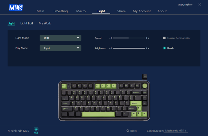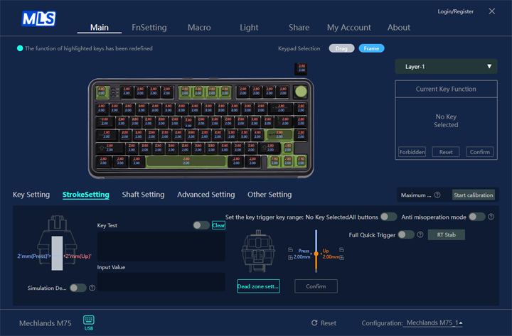 The software utility to control the MechLands M75 is a standalone application called MechLands Driver. It is available through the manufacturer's website as a 66.2MB compressed ZIP file that can be extracted and installed onto your system. The overall user experience is a bit better than what I had to use with the Vibe75. All the menus are located on the top ribbon menu. The Main page is where you can change what each key does, change the actuation trigger range, and set up macros. As these are Hall effect switches, you can also set up some additional settings that let you take advantage of the analog nature of these switches. First is DKS, or Dynamic Keystroke, which lets you set up four functions on four distinct positions of the keystroke. MT lets you set up two functions based on whether you hold or tap the key. TGL lets you enable continuous key triggers whether you hold it down or if you double tap it. Finally, there is one called snap key, which lets you set up a pair of keys so that when both are pressed, the last keystroke is the only one recognized. These functions are meant to help with gaming functions, although MechLands warn that some first-person shooter games may ban you if you use these features, so use at your own caution.