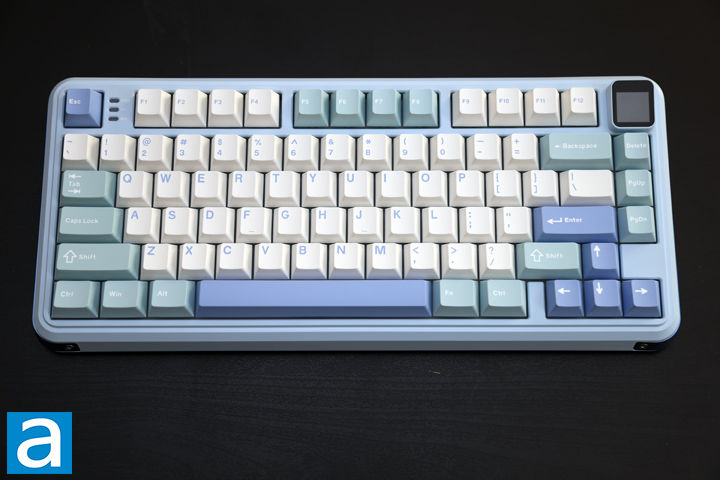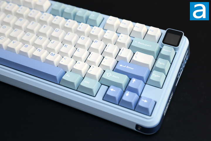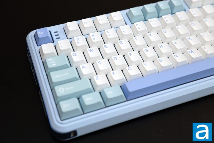 The MechLands Vibe75 has a unique look from the outset, even if there are many traditional aspects too. For one, there is a typical frame that goes around the keyboard. Instead of straight angles, there are very notably curved corners, while the edges slope downward and out. The keyboard is very bright in color with its multiple shades of blue on the keycaps and the keyboard itself. The different shades of blue can be found on all non-alphanumeric keys as well as the middle set of function keys. Meanwhile, the white keycaps have blue legends in keeping with the theme. An aluminum border wraps around the sides and top to add a cool-to-touch material around the edges. The top right side has a small screen here by default, although you can swap it out for a traditional volume knob, which is included. Overall, I really like the blue shade of the MechLands Vibe75. It does seem a bit more bulged out with its curved corners, but it provides nice vibes. If you are not a fan of the light blue, the Vibe75 also comes in a red and black model, which looks too gamer-like to me.