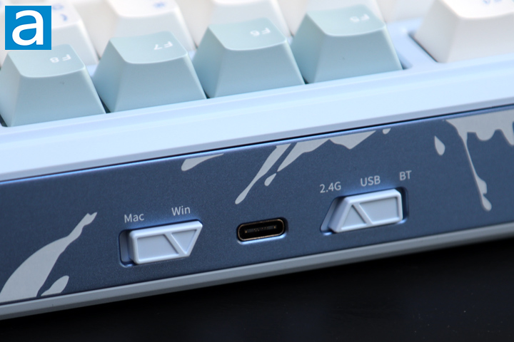 At the back, there are two switches to make further modifications to the MechLands Vibe75's operation. On the left side, there is a toggle to choose between Windows and Mac keyboard layouts. On the opposite side, there is a three-position switch to choose the connection mode. This includes 2.4GHz over the wireless USB transmitter, wired connection, or one of three Bluetooth connections. MechLands does not specify what version of Bluetooth is implemented on the Vibe75. When the keyboard connects with USB, whether wireless or wired, it will report at a 1000Hz rate, while Bluetooth is 125Hz. I did not notice any lag when using the Vibe75 with the wired or wireless USB connection, but there was a bit of perceived lag over Bluetooth. However, this lower reporting rate will help with battery life.