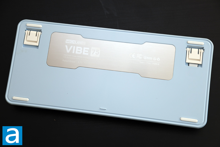 The bottom of the MechLands Vibe75 is clean with a few interesting elements. The first one is the metal plate in the middle, which has the product name and description etched into it. It also states this was made in China. Each corner has rubber padding to keep the keyboard in place. This ensures the Vibe75 does not easily move about. On the top corners, there are a pair of paired extending feet. This provides a total of three different incline levels, letting users choose how high or low they want their keyboard to sit. All the feet are rubber-tipped to provide a grippy hold to its surface when inclined. Under one of the feet, a small hole is present to hold the USB transmitter. This is especially handy, so you do not accidentally lose the short connector.