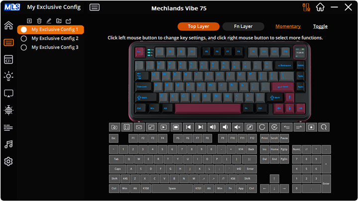 The software utility to control the MechLands Vibe75 is a standalone application available through MechLands' website. It is a 6.86MB compressed ZIP file that can be extracted and installed onto your system. Unfortunately, it is not a polished product, with several visual bugs and minor spelling errors. All the menus can be found on the left side menu. This includes setting up profiles, macros, lighting effects, and other global settings. Interestingly, there were multiple pages for lighting modes, as this included setting up the lights to react to music playback as well as other things. It is not clear why they separated the effects into several pages. You can also update the firmware for this keyboard, but I did not end up needing to do so. Overall, the utility is functional enough, but it felt quite clunky to use. If you do not need to use any of these functions, I would avoid downloading or installing it.