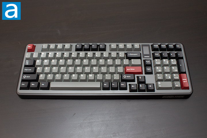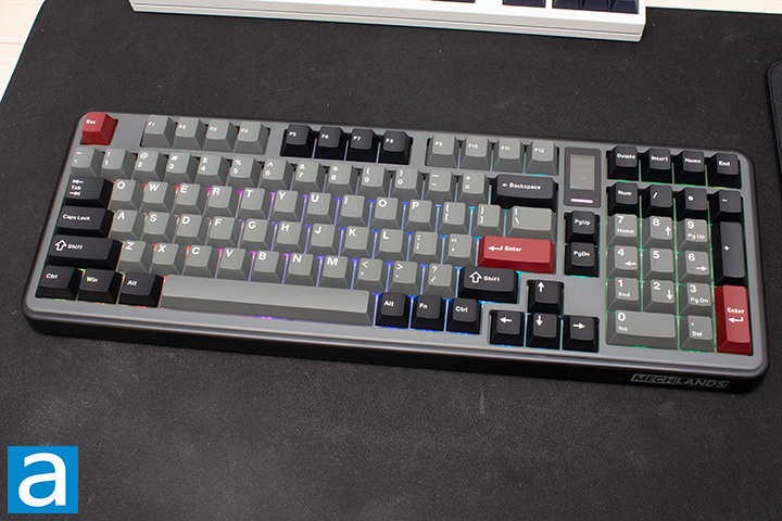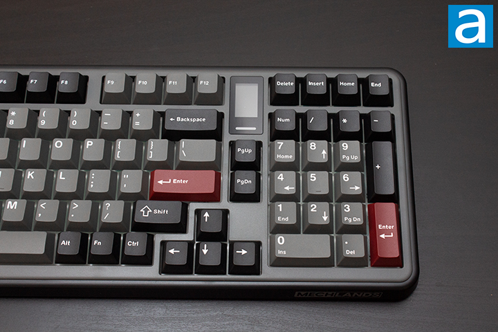 The MechLands Vibe99 comes in an exploded 1800 QWERTY ANSI layout. The standard 1800 layout typically has about ninety-eight or ninety-nine keys, depending on how tightly the F row is clustered. You might think the Vibe99 will have less keys due to it having a screen, but you would be mistaken as there are actually one hundred keys on this keyboard. This is because for MechLands to add the screen to the Vibe99, they actually had to expand the keyboard slightly, which enabled them to add the page up and down keys. The ANSI layout is the standard American layout, which uses the single row Enter key, as seen in some of the earlier images. The keyboard does not use a standard bottom row. For those who do not know, 1U standard for a single unit, meaning a 1.25U keycap is 1.25 times wider than a regular one. As such, all of the bottom row keys aside from the space bar and arrow keys are 1.25U for a standard bottom row. In the case of the Vibe99, the right Alt, Fn, and Ctrl keys are 1U to maintain space for the arrow cluster. I personally would have preferred to shrink the number pads 0 key in favor of a wider Shift key, but this is a moot point as this is a personal preference. For the average user, the typing experience will feel relatively the same, as the only difference is the smaller right shift and some missing right modifier keys.