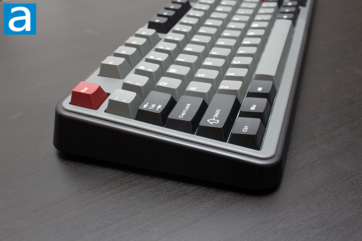 As for the keycaps, these are made out of PBT plastic or polybutylene terephthalate, as previously mentioned. I personally prefer PBT, as the material is harder and resists shining better. The lettering is printed out on the top of the keycaps using a double shot process, which is created by injecting plastic into two different molds and pressing them together. Double shot offers the same or better quality of printing compared to dye sublimation, offering great quality in the case of the MechLands. The coloring and legending are sharp. In terms of warp and shine, PBT is an excellent material, as it is decently resistant to both of these qualities. The font used is quite sharp and consistent with the rest of the board, which is something I find nice. A small detail is noticed is that the Alpha keys font thicknesses are quite consistent, but when it comes to the modifiers, there is some variation.
