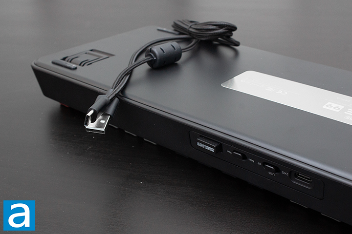 Taking a peek at the bottom of the keyboard, we have four rubber feet. The feet on the bottom side are average in size, doing a great job of keeping the keyboard in place. There should be no noticeable unintentional sliding. There is no cable raceway to manage cables, as the MechLands Vibe99 uses a detachable cable design. This is my personal preference, as it makes swapping between keyboards easier. The included braided 1.8m USB Type-C cable is greatly appreciated. As for the battery, we have a 4000mAh battery, which should last a plenty of time as long as you keep the LEDs off. In my testing, I found the battery life only lasted about two days with LEDs on, but just under two weeks with LEDs off. Given these results, I recommend using this keyboard wired if you plan on keeping the lights on.