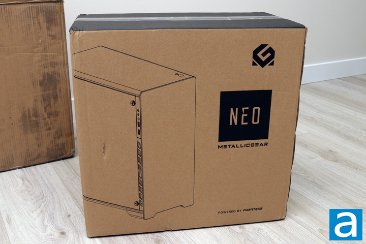 Unfortunately, it does look like some of the bruises and one hole made it through the shipping box and to the retail container of the MetallicGear Neo. As you can see, the box itself is pretty minimal. This panel shows off an outline of the Neo with the product name and manufacturer's name and logo on this area. At the bottom you can see a "Powered by Phanteks" tag to show where this product hails from. We have not seen a Phanteks case for a while, but both my colleague Jonathan Kwan and I have had first-hand experience with their cases. The whole Neo lineup seems to be a target at a minimal design and high quality materials used while keeping the price low. I presume all their products will have metal or metal-like materials used, at least based on the brand. We will see what that translates to when we take a closer look at the Neo later on.