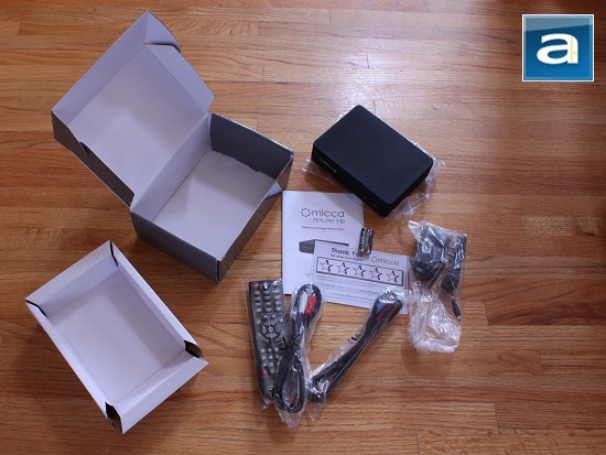 Our Micca MPLAY-HD arrived at the same time as the Micca MPLAY from the company's offices in Fairfax, Virginia, USA to our location here in Calgary, Alberta, Canada via USPS Priority. They sent both digital media players to me for review, so I chose to get on the HD one first. Both of them came in a rather large brown corrugated cardboard box. Although the shipping seemed fine, my picky picky eyes picked up that the MPLAY-HD box appeared to be somewhat dented at the corner. A real issue? Not by a long shot. Everything else arrived in perfect condition with absolutely no complaints.