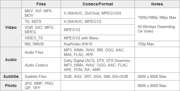 - External Subtitles: SRT, SSA, ASS, SMI, SAMI, TXT, SUB, SUB+IDX, MKS (subtitle and video should have the same file name)