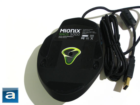 Flipping the Mionix Naos 5000 over, we are treated with a view of the bottom of the mouse, as shown in our photo above. The bottom of the mouse is made out of plastic. Prominently shown is Mionix's logo around the areas of the optical sensor; additionally we have a Mionix label at the top displaying the product name and model number. The Naos 5000 also utilizes four sheets of polytetrafluoroethylene (Multi-C2F4, Teflon) feet which are all attached to the bottom of the mouse. It appears that these feet can be replaced by the user if they eventually wear out. Although we are not given an estimated amount of time that these Teflon feet will last, it should be fairly safe to assume that it will be at least as long as the lifetime of the mouse. This assumption is based on calculations we have done with previous Teflon feet equipped mice that we have owned in the past.
