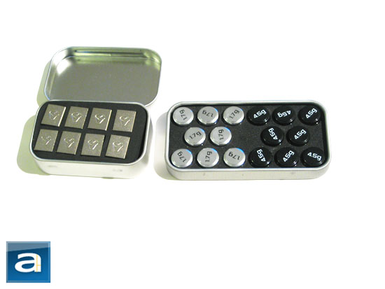As previously mentioned, the Mionix Naos 5000 includes a tin case full of weights for further user customization in adapting to different user preferences. The weights actually look more similar to those of the Logitech G9, and less so of the Logitech G500 weights; the latter is shown in our photo above. The tin case design looks almost identical to that of the Logitech G500, but it does include a hinge at the back, so the cap cannot disconnect from the case. The Mionix weight box also has a polished shiny surface, instead of the matte finish on the Logitech mice. The only problem I can see with these weights is that they are all eight of them are 5-gram units. These may be too heavy for some users looking for more precise weighting configurations -- it would have been nice to see them come in a series of different weightings instead rather than just one single weight.