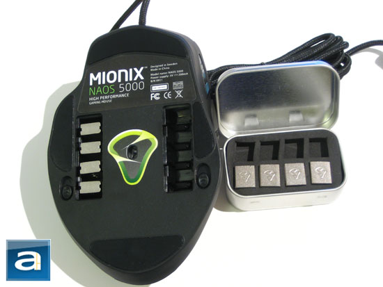 Physical packaging was done well with the Mionix Naos 5000. Pull off the upper cover portion of the box, and the mouse as well as its accessories are revealed. Not surprisingly, there is not very much inside the box. An increasing amount of companies now have their drivers posted online, and have stopped including driver CDs out of the box. This not only reduces waste, but it also makes for lower production costs. That's not to mention that most enthusiasts don't bother with installing drivers from included media to ensure the most up to date version is installed on our computers anyway. Out of the box, you will receive the following contents: the Mionix Naos 5000 mouse itself, a tin case that holds the weights, and a tiny information card. Internal partitioning involves a plastic layer molded into the shape of the mouse and weights, with a cardboard cut-out on top to hold the pieces in place. Design wise, it is as minimal as it can be, but at the same time effective and practical.