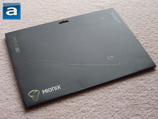 The cardboard case the mousepad comes in has a very clean looking design that reflects the sharp black color of the gaming surface. The Mionix logo is shown on the front vividly beside the image of the mousepad itself. Overall, the Propus 380 comes in a respectable package, and comes with a sleek look. The underside of the mousepad's case shows the basic product information, along with the summary of the product. This exact information can also be found on Mionix's website. Here is the description of the mousepad: