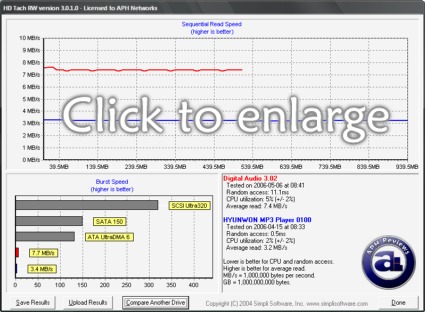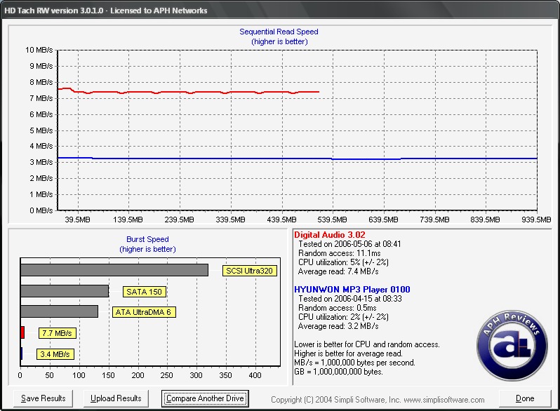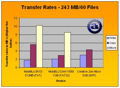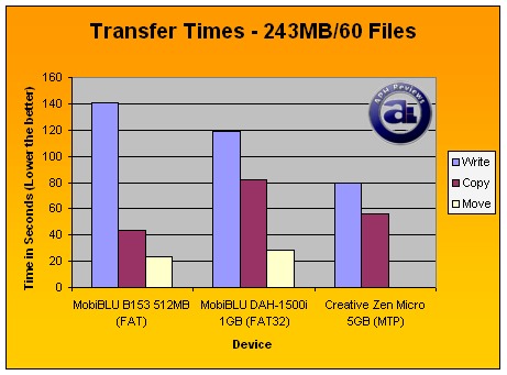 Our test system's hard drive is formatted using NTFS file system, while MobiBLU's DAH-1500i uses its default file format (FAT32) along with MobiBLU's B153 using FAT (Also its default file system) and the Creative Zen Micro 5GB connected as an MTP device. This will represent performance as close to real life as possible, since this is likely of how you will transfer songs.