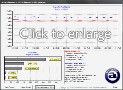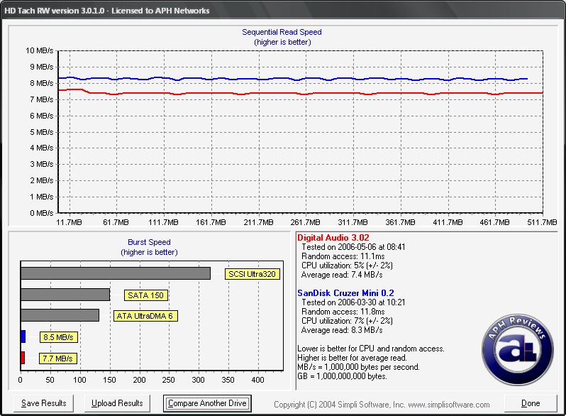 CPU utilization as well as random access is nearly identical with my Sandisk Cruzer Mini 512MB. However, the Cruzer Mini consistently beats the MobiBLU B153 by nearly 1MB/s in our read tests.