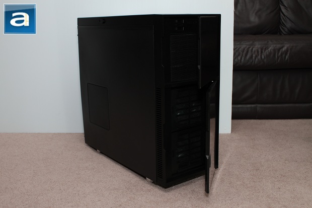 For some of you that have been around here for a while, you will notice that this case appears to be "deeply inspired" by the Fractal Design Define R4 and Fractal Design Define XL reviewed by my colleague Jonathan a while back. The front panel is made out of plastic, and features two sections, with access to three 5.25" bays, two fan controllers, reset button on the top; and access to two 120mm fans on the bottom. The 5.25" covers can easily be removed by unlatching the lock on the right side of each of the bays. Each of the fans is removable as well. Just give the left side a gentle push, and since it is spring loaded, the fans will swing out. A removable dust filter is included for each fan. Both of these sections houses a slick plastic door padded with foam for sound dampening. Although the front panel looks slick, one thing I would like to complain about is that it is a fingerprint magnet. Fortunately, this is quite easy to clean off; simply take a cloth, and wipe it down. The left panel doesn't feature anything special, except for the fact it is able to accommodate a 120mm or a 140mm fan (Wonder where we have seen that before?). This is available to you when you take the small panel off from the inside, as four screws hold the plastic place, making the side look cleaner when no fans are installed. This also helps out in keeping noise in, and the dust out. The Nanoxia Deep Silence 1 measures in at 517mm in height, 220mm in width, 532mm in depth, and weighs in at 11.34kg, according to Nanoxia. This is slightly larger than most average mid-sized chassis, but is decently weighted. However, by the time you have all your computer parts fitted in, you will notice how heavy it will inevitably get.
