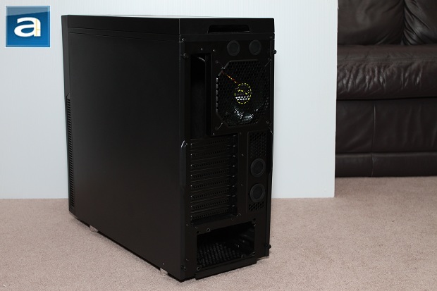 As usual, you will find the exhaust fan at the back of the case next to the I/O panel, followed by four water cooling holes readily available. If you decide not to use water cooling, Nanoxia provides you with four rubber grommets that close off the holes. This is in addition to the other four rubber covers that allow water cooling tubes to pass through. As you can see in our photo above, there are eight expansion card slots, which is more than plenty for the average user. Last but not least, you will find the power supply opening at the very bottom. The side panels are held in place using thumbscrews. This is a nice feature to have in saving time instead of pulling out your screwdriver every time you need access to the internals of your computer.