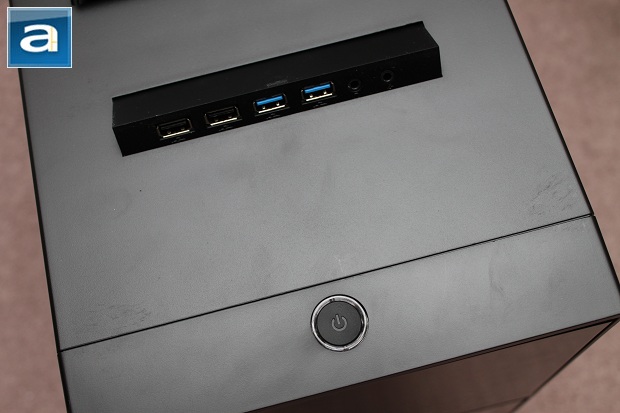 Switching our view to the top of the case, you will find the power button encompassed by a clear plastic ring. The ring will light up green when you power on your computer. Cool. When is the last time you have seen a green LED glow? This adds as nice eye candy for most users. You will also have access to two USB 2.0 ports, two USB 3.0 ports, and the usual 3.5mm headphone and mic jacks. Just behind this area is what Nanoxia calls the "chimney", which I will explain just after the next photo for a clearer idea.