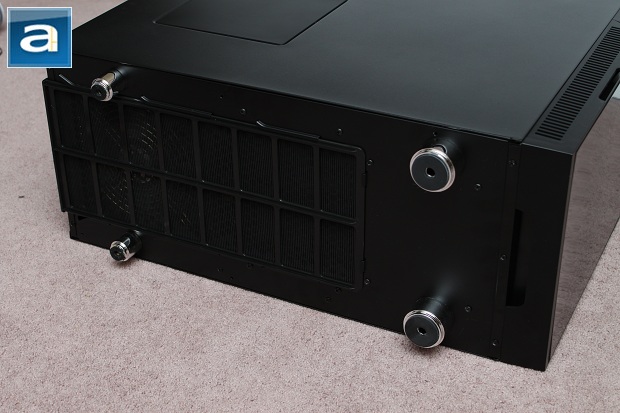 The bottom features four shiny legs, each fitted with a layer of rubber for those that want to put their computer on hard surfaces. This prevents the case from slipping and sliding around too much, not that it will move around that much anyway. Also, a washable removable dust filter is fitted under and beyond the power supply area to prevent unwanted particles from entering your system and clogging up your expensive components.