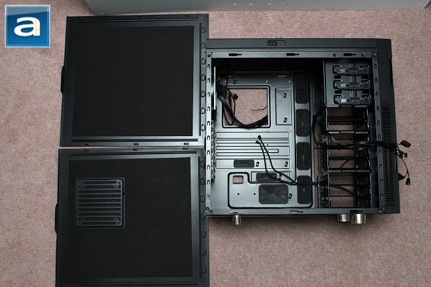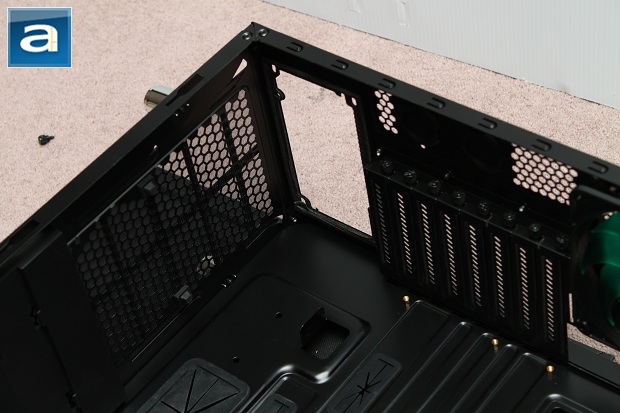 Because the Nanoxia Deep Silence 1 features a bottom mounted power supply bay, it is raised approximately a centimeter off the ground to accommodate units with bottom mounted fans. This is done simply by sticking in two rubber grooves. As mentioned previously, there is an externally removable dust filter to prevent nasty stuff from getting into your computer. The expansion slots come with thumbscrews for the convenience of the user instead of having to pull out their tool set.
