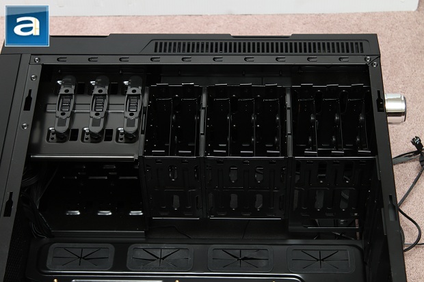 Shifting our attention a bit, you will notice that the Deep Silence 1 features a top to bottom rack to support 5.25" and 2.5"/3.5" drives. The top is able to support up to three 5.25" drives, where the rack can support eight 2.5"/3.5" drives, as mentioned previously. The 5.25" bay features tool-free clips on both sides to mount the drives securely. These are quite easy to play with; simply slide to one side and let the springs do the work, then give it a push and slide it back to lock the drives in place. The hard drive rack is separated into three sections. Two of the three sections can be removed easily by lifting a clip accessible from the back side. The last and bottom-most section is also removable, but you'll need to pull out your Philips-head screwdriver to removes a total of six screws in order for that to happen. The two removable HDD/SSD racks could also be easily mounted between the semi-permanent HDD/SSD rack and the power supply bay as Nanoxia provides a mechanism at the bottom of the case for you to slide these racks into place.