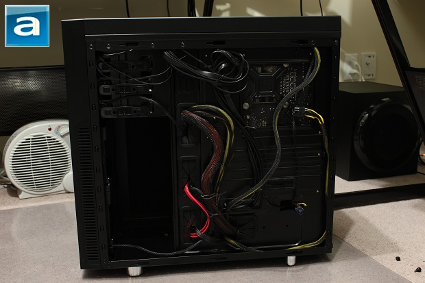 Although most people may care less about the back side, I find it extremely important that this side provides enough space for an easy clean cabling job. The Nanoxia Deep Silence 1 provides the user with sufficient space at the back. As you can see from the photo above, although my cabling job may not be the neatest, it still has sufficient enough space to support the thicker cables without having you to sit on top of your panel in order to close it. However, you can also see that aftermarket heatsinks with backplates may be a bit difficult to install as the opening is not quite big enough to support shifted sockets.