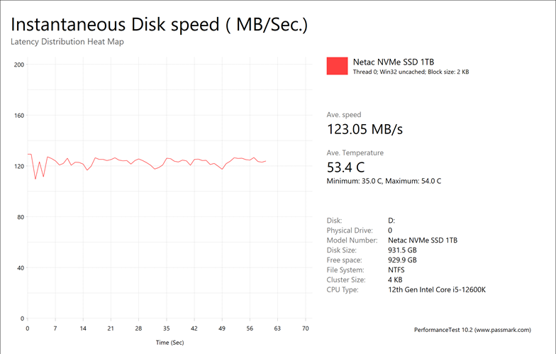 The Netac NV7000-Q 1TB provided us with middling results of 123.05MB/s, 972.74MB/s, 3338MB/s, and 242.05MB/s. This was similar in performance to the NV7000-t 1TB, which had numbers of 131.61MB/s, 1008MB/s, 3218MB/s, and 241.28MB/s. The fastest results I have seen overall came from the Lexar Professional NM800 PRO 2TB, with speeds of 444.92MB/s, 3259MB/s, 3453MB/s, and 282.82MB/s, respectively. Other DRAM-less drives include the WD_BLACK SN770 1TB with numbers of 366.45MB/s, 2716MB/s, 2915MB/s, and 300.29MB/s and the Crucial P3 Plus 1TB with results of 267.34MB/s, 1986MB/s, 2044MB/s, and 253.39MB/s. Finally, the XPG Atom 50 1TB was another DRAM-less SSD with results of 32.46MB/s, 519.21MB/s, 2095MB/s, and 210.09MB/s. Thankfully, the Netac NV7000-Q 1TB was faster than the Atom 50, but this was a low bar to clear.
