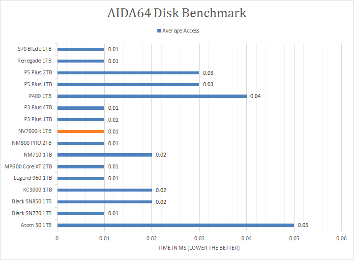 As you can see from our graphs above, the Netac NV7000-t 1TB was in the back of the pack for most of these results. It averaged around 5860MB/s in the linear read tests, while achieving slightly lower but similar random and buffered read numbers. The test latency was one of the lowest at 0.01ms, which is a good result. Compared to other drives, you can see these numbers were ahead of the WD_BLACK SN770 1TB and the two capacities of the Crucial P5 Plus. On the other hand, other DRAM-less SSDs like the Crucial P3 Plus and XPG Atom 50 were superior. Otherwise, comparisons can be made with our other drives in the graphs above.
