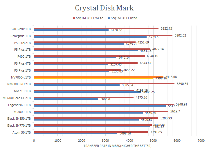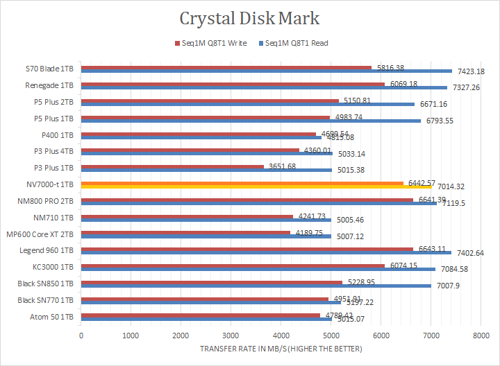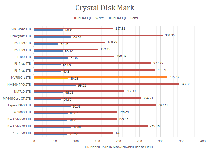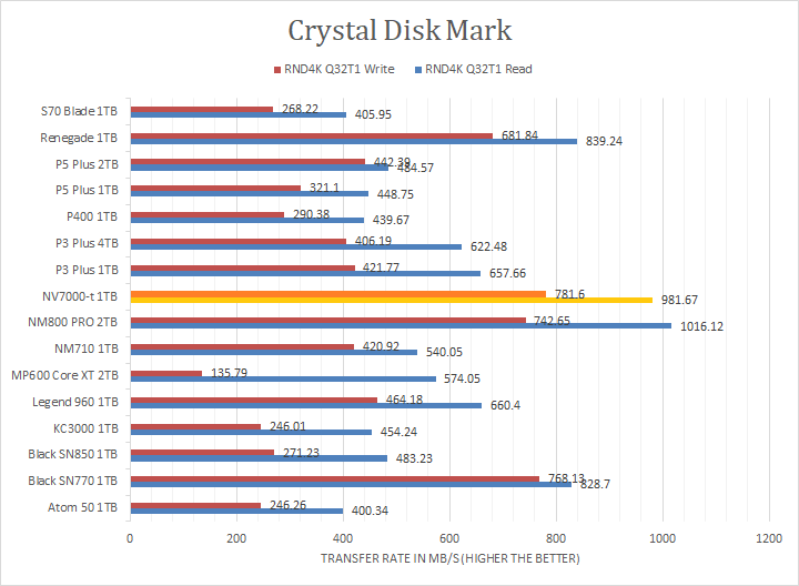 Netac claims the NV7000-t 1TB has maximum read and write speeds of 7300MB/s and 6600MB/s, respectively. Looking at the sequential results, the NV7000-t 1TB was not able to reach these quoted speeds like ATTO, but we did get closer in Crystal Disk Mark. The results of the NV7000-t 1TB across the board were generally quite positive, with above average read and write results for both sequential and random tests. You can see in the single queue, single thread sequential, the NV7000-t 1TB had the second fastest read and fifth fastest write. Similarly, in the random, 32 queue test, the NV7000-t was second and first in read and write, respectively. When compared with other DRAM-less PCIe 4.0 NVMe drives, it was hands down one of the fastest drives across all of the results, even surpassing more premium options with dedicated memory.