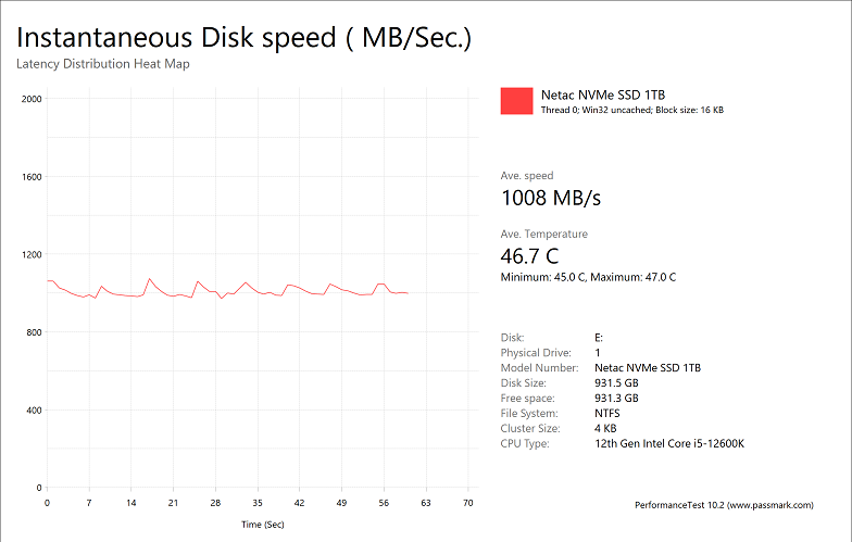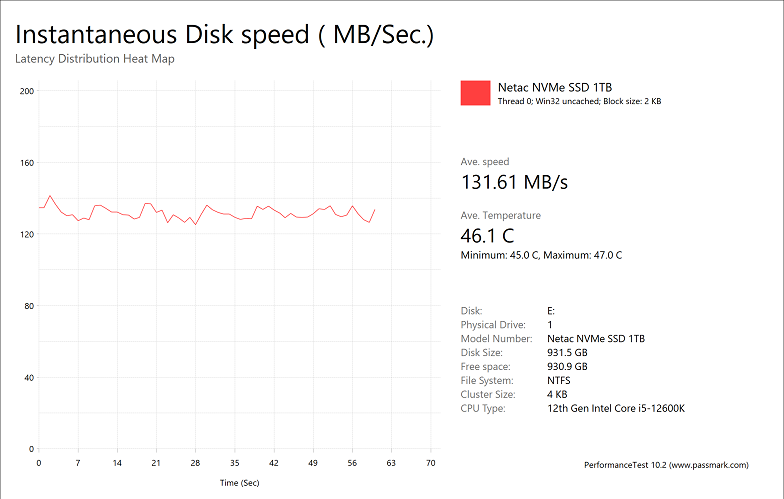 The Netac NV7000-t 1TB provided us with below average results of 131.61MB/s, 1008MB/s, 3218MB/s, and 241.28MB/s, respectively. The fastest results I have seen overall come from the Lexar Professional NM800 PRO 2TB, with average speeds of 444.92MB/s, 3259MB/s, 3453MB/s, and 282.82MB/s, respectively. Other DRAM-less drives include the WD_BLACK SN770 1TB with numbers of 366.45MB/s, 2716MB/s, 2915MB/s, and 300.29MB/s and the Crucial P3 Plus 1TB with results of 267.34MB/s, 1986MB/s, 2044MB/s, and 253.39MB/s. Finally, the XPG Atom 50 1TB was another DRAM-less SSD with results of 32.46MB/s, 519.21MB/s, 2095MB/s, and 210.09MB/s. Thankfully, the Netac NV7000-t 1TB was still a bit ahead of the Atom 50, but the NV7000-t was not anywhere close to the best in this test.