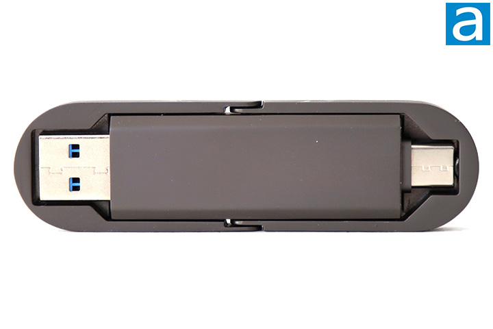 Turning the Netac US9 around, and you can see how the ports and its door mechanisms work. The US9 features both USB Type-A and USB Type-C ports, which is a rare find on USB drives. The USB Type-A interface connector is blue to signify its USB 3.2 Gen 2 compatibility. Both are semi-covered by a swinging door that rotates about the center axis by a pair of hinges. I am a big fan of capless flash drives, since you will not need to worry about losing their cover during usage. The USB Type-A port door clicks into place by a magnet, while the USB Type-C port clicks into place by a notch at the end. One thing to pay attention to is the doors may interfere with adjacent ports when in use depending on the direction of the way the connector doors swing and the adjacent port location.