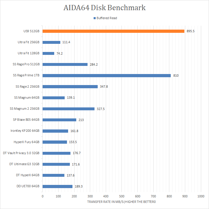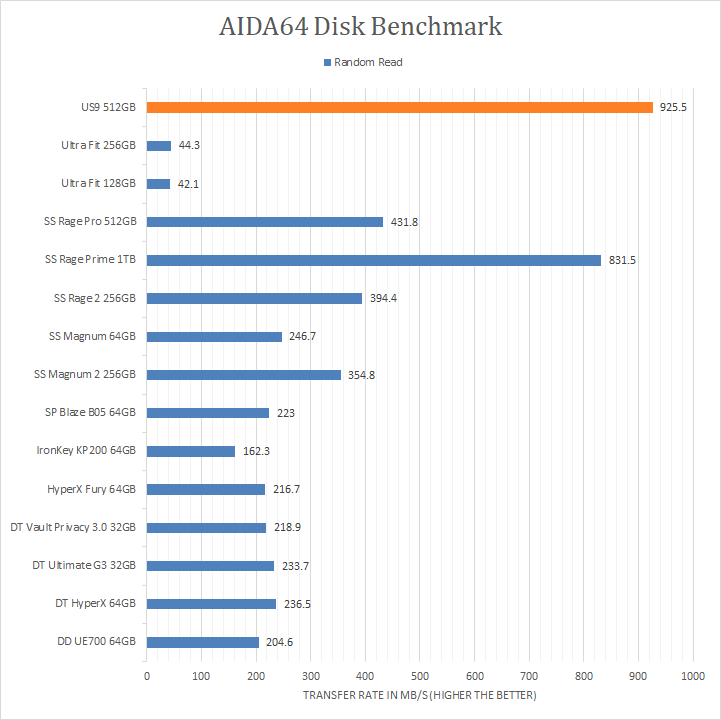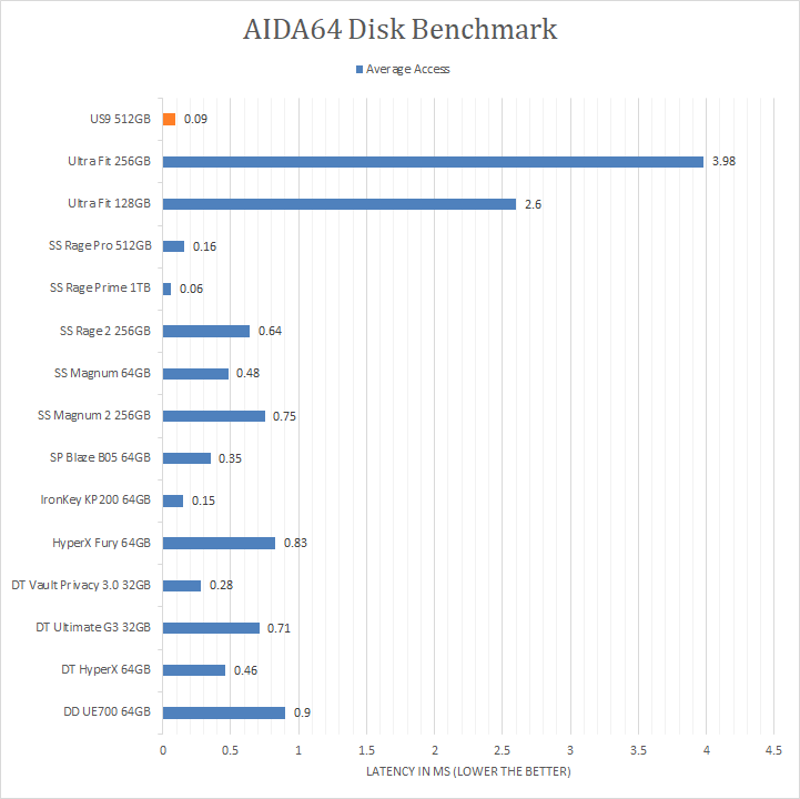 As you can see in our graphs above, the Netac US9 512GB's results absolutely destroyed everything else we have on our list. It led by a wide margin compared to the second fastest drive, the Patriot Supersonic Rage Prime 1TB. It scored consistently around the 950MB/s mark in the linear read segment. The tested latency was very low with an average of 0.09ms. The rest of the comparison results against all the other drives can be seen in our graphs above.