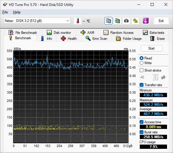 Unfortunately, HD Tune does not generate any fancy independent graph outputs in particular, so I just took a screenshot of the program. The Netac US9 512GB's throughput remained very flat on average. While HD Tune is more of a drag race than a clear indication of real-life performance, it is an excellent storage performance reference among SSDs with the same controller. The results were good across the range and the recorded access time was low, as we would expect from a solid state drive.