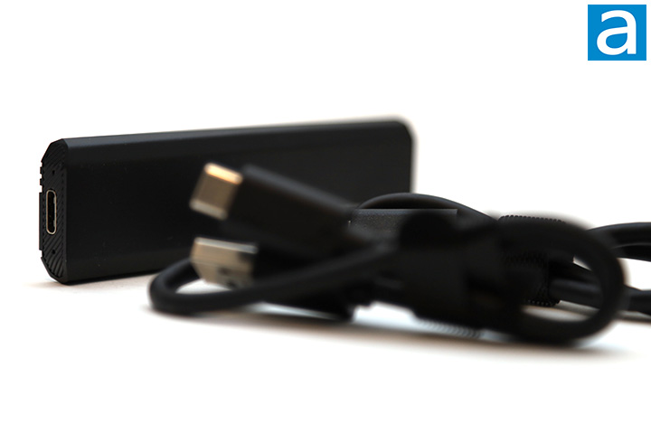 One 30cm long USB Type-C to USB Type-C cable and one 30cm long USB Type-C to USB Type-A cable are included and plugs into the left side of the drive. The included cables are very reasonably long, and I am glad they included a Type-A cable for those who need it, even though pretty much every new PC has a USB Type-C port in 2024. Two tiny blue LEDs can be found next to the SSD's USB Type-C port. They stay on when powered and blink to indicate drive activity.
