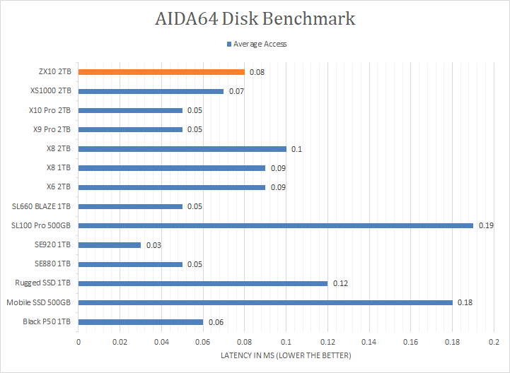 As you can see in our graphs above, the Netac ZX10 2TB's results were in-line with other portable USB 3.2 Gen 2 solid state drives. You can probably tell which ones these are -- the Kingston XS1000 2TB, Crucial X9 Pro 2TB, both Crucial X8s, Lexar Professional SL100 Pro 500GB, and LaCie Rugged SSD 1TB. It scored consistently around the 930MB/s mark in the linear read segment. Faster drives include USB 3.2 Gen 2x2 models and the ADATA SE920 1TB, which is USB4. The tested latency was very low with an average of 0.08ms. The rest of the comparison results against all the other drives can be seen in our graphs above.