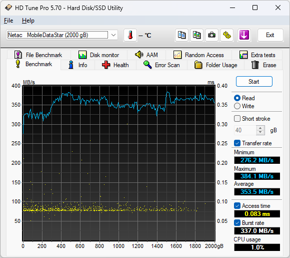 Unfortunately, HD Tune does not generate any fancy independent graph outputs in particular, so I just took a screenshot of the program. The Netac ZX10 2TB's throughput remained very flat on average. While HD Tune is more of a drag race than a clear indication of real-life performance, it is an excellent storage performance reference among SSDs with the same controller. The results were good across the range and the recorded access time was low, as we would expect from a solid state drive.