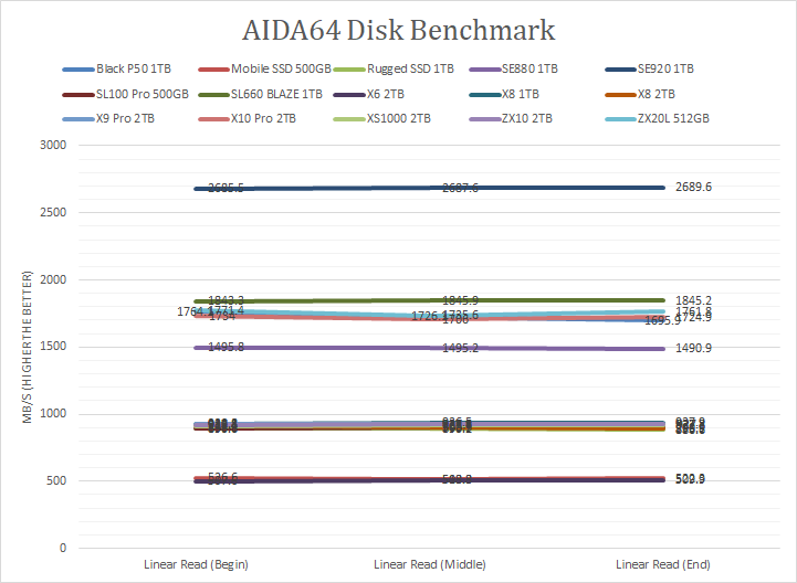 Since our SSD review benchmark results are presented in alphabetical order, first up on the list are results from one of our favorite benchmarking programs, AIDA64 Engineer. Version 7.65.7400, the latest release at press time, can be downloaded from our Downloads page. Just to note, AIDA64 Engineer is a full synthetic benchmark. Unlike full synthetic motor oil, this usually does not always carry a good connotation. While it is not a representation of real-life performance -- such as how fast copying 50,000 photos occurs -- it does provide valuable insight into performance between different drives and different controllers.