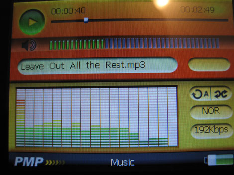 The 3.5" 320x240 screen offers quite a bit of room, especially in the music displaying screen. A status icon is shown in the top left corner. Beside is a progress bar, showing elapsed time and time remaining of a certain track. A wide volume bar is situated above a large bars-and-wave visualization. A few button-looking graphics shows miscellaneous info such as play mode and bit rate.