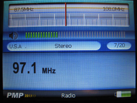 A blue gradient background covers the FM radio screen. It retains the element placement scheme of the music playing screen, which is great as it retains a degree of consistency with the player's user interface. There's no FM recording function available.