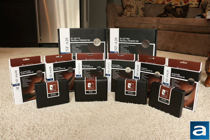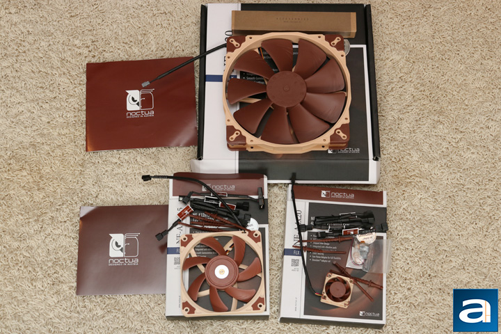 For most of this summer, I worked at a camp. It was, as usual, a great experience. Although it was a crazy hot summer in southern Alberta, the temperature made for a great summer filled with plenty of fun activities. But the heat also made the cabins became extremely hot. This was the worst at night, where it was almost impossible to sleep. We had to think of different ways to cool down the cabin. Some people thought it would be a good idea to get a big fan with a bucket of ice in front of it, but we did not end up doing this. One of the ideas actually worked really well. When it was late in the evening, we would set up two fans; one at each window of the cabin. One fan would be blowing air into the cabin, and the other would be blowing air out. This would move the air around the room and quite effectively cool the cabin down by the time we went to bed. Now, I probably should have thought of the idea, since it is basically the same as what a computer cooling system does. Some fans pull air in, and others push air out. There is more to it, but at its base this is all that happens. I think there is a lot more to consider when it comes to case fans than with fans for a room though. There is a wide variety of models and manufacturers to choose from when it comes to picking a case fan. Some are more focused on silence than performance, or you can go a balanced route, finding one that performs quietly. Other fans are more focused on static pressure, while some more on airflow. One manufacturer known for its quality, performance, and silence is Noctua. Today, we have the entire Noctua NF-A series up for review, including eight fans, some anti-vibration mounts, and a fan controller -- all of which I will be covering in this one review today.