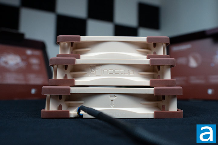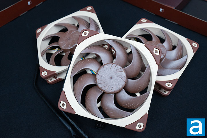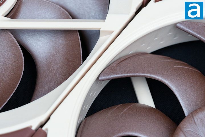 The Noctua NF-A12x25 G2 series is a smaller version of the NF-A14x25 G2 series, and is the successor to the Noctua NF-A12x25. The Noctua NF-A12x25 G2 series features the brand's iconic color scheme of brown and beige. Anti-vibration pads are installed on the four corners to reduce minute vibrations, while also providing a visual contrast to the beige frame. Towards the center of the frame, there is a stepped inlet design. This design helps direct airflow and reduces tonal noise. A small amount of turbulence helps the air to stay attached to the surface of the fan longer, thereby guiding it in towards the impellers. Laminar flow also creates a pure tone that is more distracting than the broadband frequency noise created by turbulent flow, which blends into background noise. The brown impellers are made of LCP, liquid crystal polymer, which has higher tensile strength and thermal expansion resistance compared to other commonly used thermoplastics for fans. Noctua has further developed the LCP they use by reinforcing it with fiberglass that further increases the fan's resistance to deformation due to environmental changes and stress. Noctua has given this material the name Sterrox.