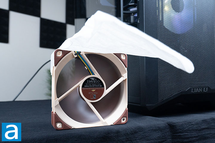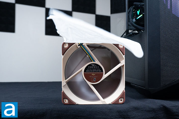 After adding the low-noise-adapter, the performance is reduced as expected. The right side of the tissue paper was lower in all sections compared to when the fan was at full power. The left side, however, still held up very well, suggesting the airflow strength was still excellent on that side. The airflow was also consistent, as observed from the minimal fluctuations of the tissue paper. The overall performance was very good, even with the low noise adapter on.
