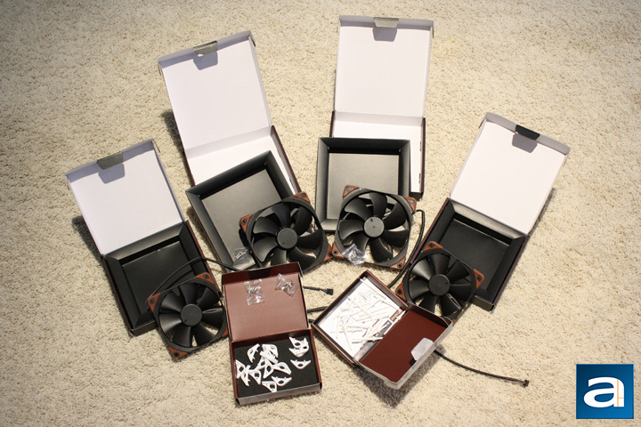 All four of the fans are pulse-width modulation, abbreviated as PWM, fans. They connect to a four pin header on the motherboard. Since these fans can take up to 24V, but within a PC the maximum would be 12V, the maximum speed will then be reduced to 1800 RPM. For sound, airflow, and static pressure technicalities, the following section has been borrowed from Editor-in-Chief Jonathan Kwan's review of the NF-F12 PWM and NF-P12 PWM fans.