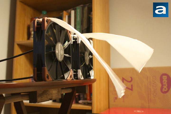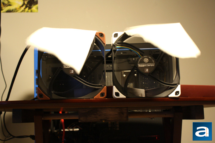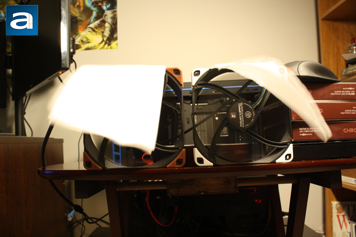 While these tests are not the most objective method for fan testing, they do give us some information of important fan attributes, such as airflow, airflow consistency, and the amount of static pressure generated. The fans are set at the edge of a desk to prevent air from bouncing back, which could hide the true characteristics of the fan. I ran the test comparing the two 140mm with each other, and the two 120mm with each other. The top two pictures are of the 120mm, and the two below are of the 140mm fans.
