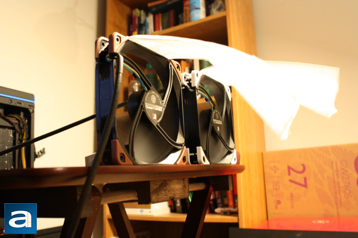 When it comes to testing the perceived sound, it was a little harder to pinpoint exactly where it would be, especially because some could be more sensitive to sound than others. I always attempt to keep the noise of my computer system as low as possible, but sometimes, it takes quite a bit of time tweaking the fan speeds to do a joint optimization of sound emissions and cooling performance. The noise levels of these fans were tested independently with no other noise source in the room. They were also tested at their maximum 12V speeds. On a scale from 1 to 10, where 1 is silent and 10 is a jet taking off, the Noctua NF-F12 IndustrialPPC 2000 RPM fan came in at 3.0/10, while the 3000 RPM version came in at 4.5/10 in my personal opinion. The Noctua NF-A14 IndustrialPPC 2000 RPM came in at 4.0/10, while the 3000 RPM version came in at 6.0/10, again in my personal opinion. The sound output is similar to what we have come to expect from Noctua, especially for a high speed fan, and with just a few adjustments in rotational speed, they should run very quietly.