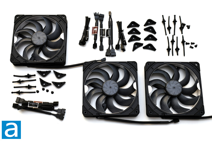 After opening the two boxes, you will notice Noctua has organized everything in a very neat and organized way, but I have taken everything out of their packaging for you to see. All the accessories and cables can be found in their own bags within a single box. Each fan comes with a respective set of NA-AVP1-LR chromax.black rubber paddings, NA-AV2 chromax.black rubber anti-vibration mounts, mounting screws, NA-RC16 low noise adapter, and 30cm NA-EC1 chromax.black extension cable. Each package comes with an NA-YC1 chromax.black 4-pin PWM splitter cable too. Each fan has a paper ring between the fan blade and the frame for protection while in transit, so be sure to remove this before you use the fan.