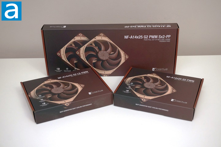 Those familiar with Noctua's latest products will immediately recognize the signature retail packaging of the Noctua NF-A14x25 G2 series fans. Noctua maintains brand consistency with a uniform design across its product lineup, featuring a predominantly brownish-red color scheme. The front of each box prominently showcases an image of the fans inside, making it easy to identify the contents at a glance. Noctua’s logo is neatly placed in the lower right corner, while the model name is clearly displayed at the top right. As seen in the photo, there are three distinct packages for the three models of the Noctua NF-A14x25 G2 series fans. The smaller box on the left contains the G2 LS-PWM model, the one on the right holds the G2 PWM model, and the larger box with the designation "G2 PWM Sx2-PP" includes two fans. The size of each box provides a clear indication of the number of fans included.