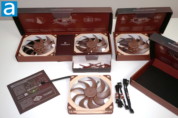Upon opening the box, you will find that the fans come with a variety of thoughtfully included accessories designed to make installation as seamless as possible. For the G2 LS-PWM and G2 PWM models, each package contains one 140mm fan, while the G2 PWM Sx2-PP includes two 140mm fans. In addition to the fans, the box includes a well-organized selection of installation essentials, such as screws, mounting hardware, and extension cables. Notably, the smaller accessories are neatly stored in a theme-colored cardboard box, which is a practical and visually appealing choice that also serves as a protective holder, ensuring the fans remain secure during transit. Noctua has also included an essential information card that provides guidance on which gaskets or pads to use on specific sides of the fan, along with a clear warning to avoid overtightening screws during installation.